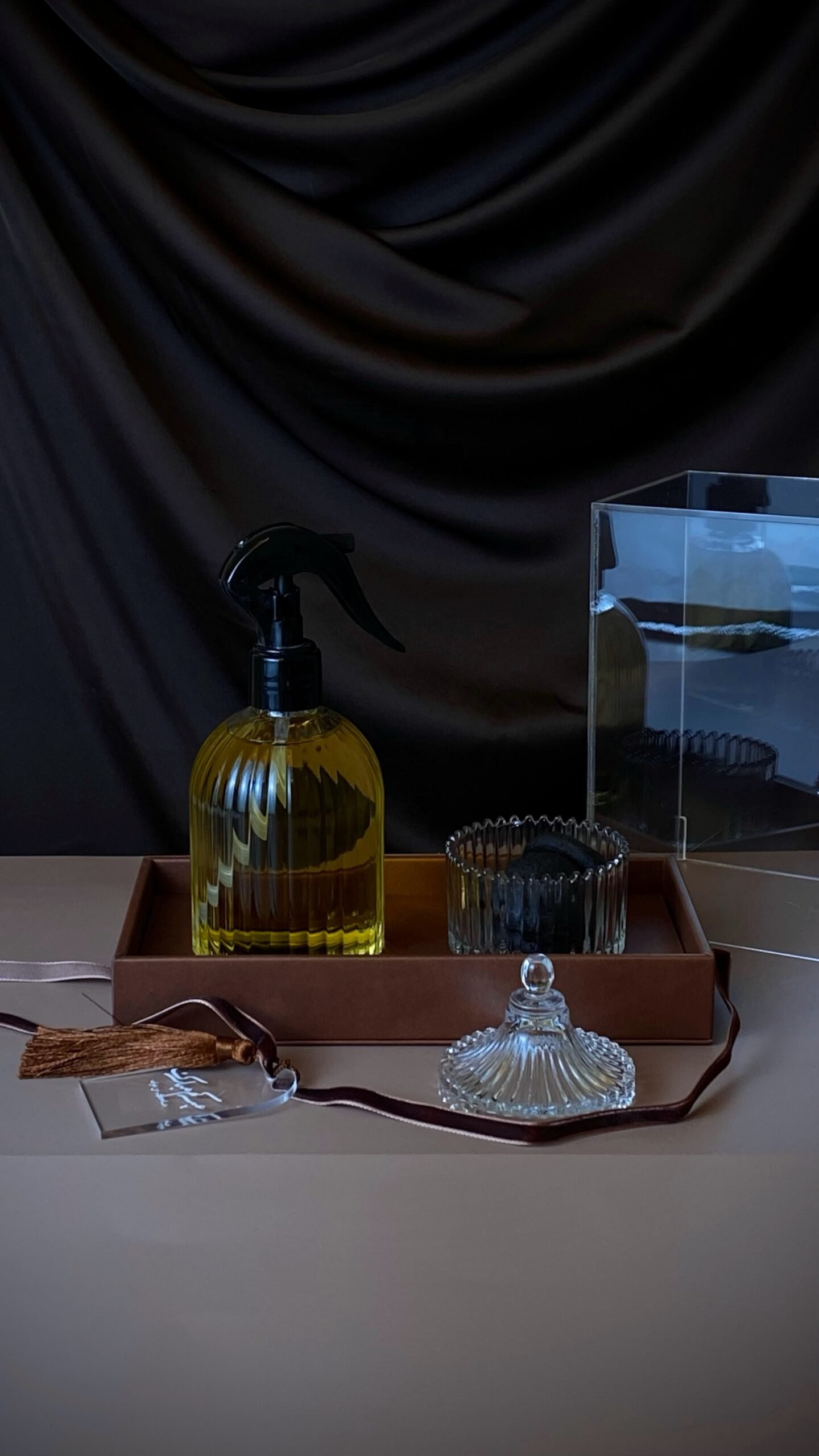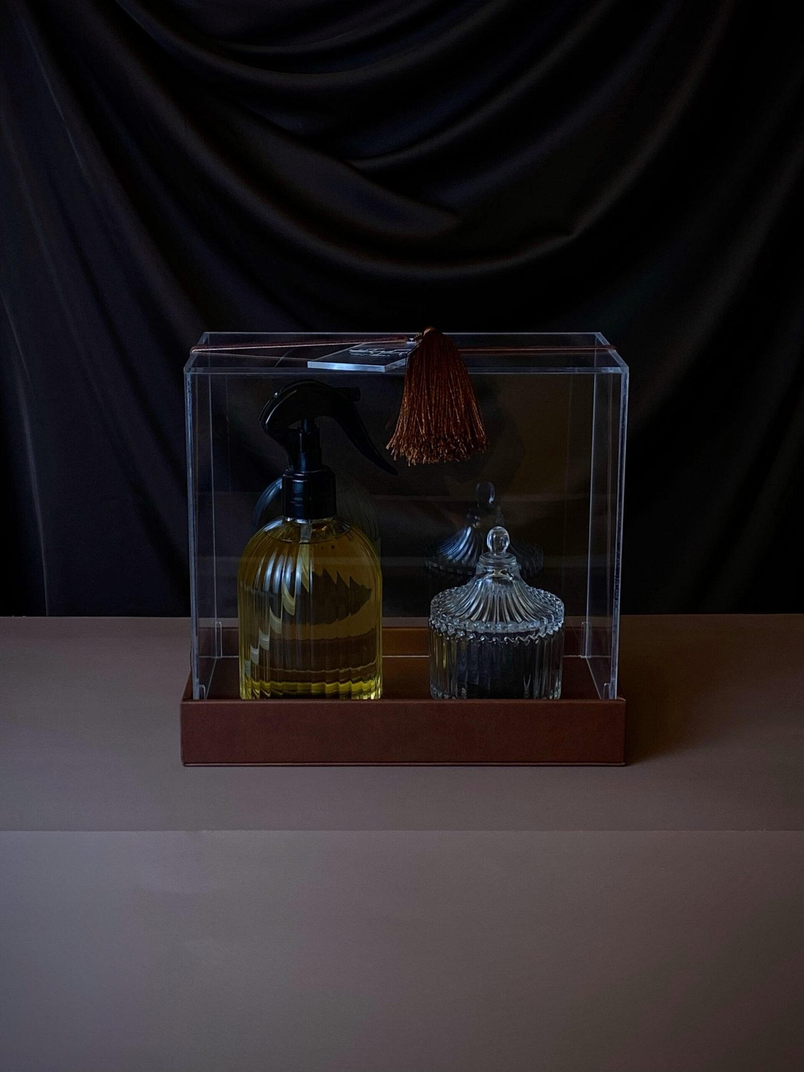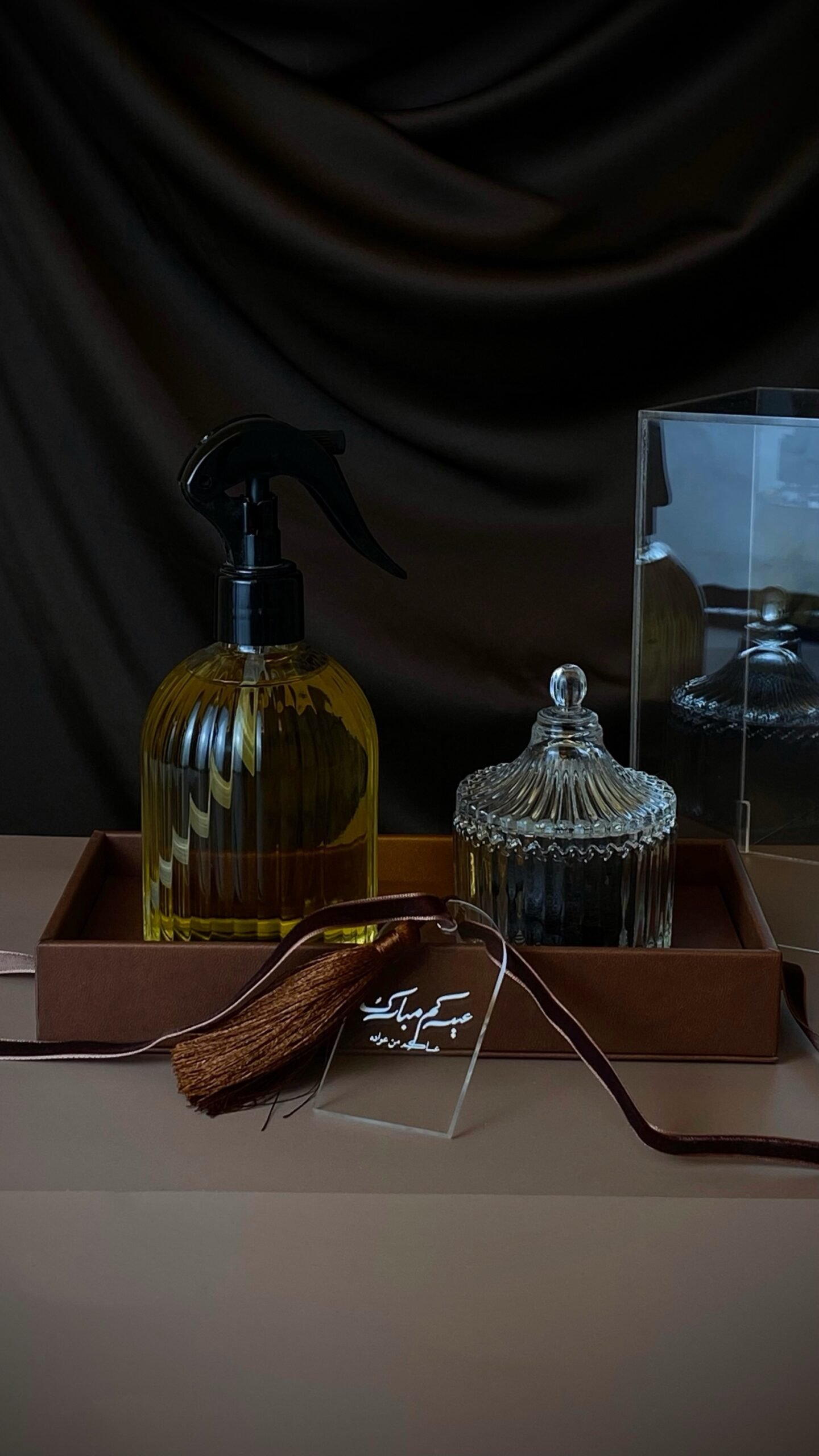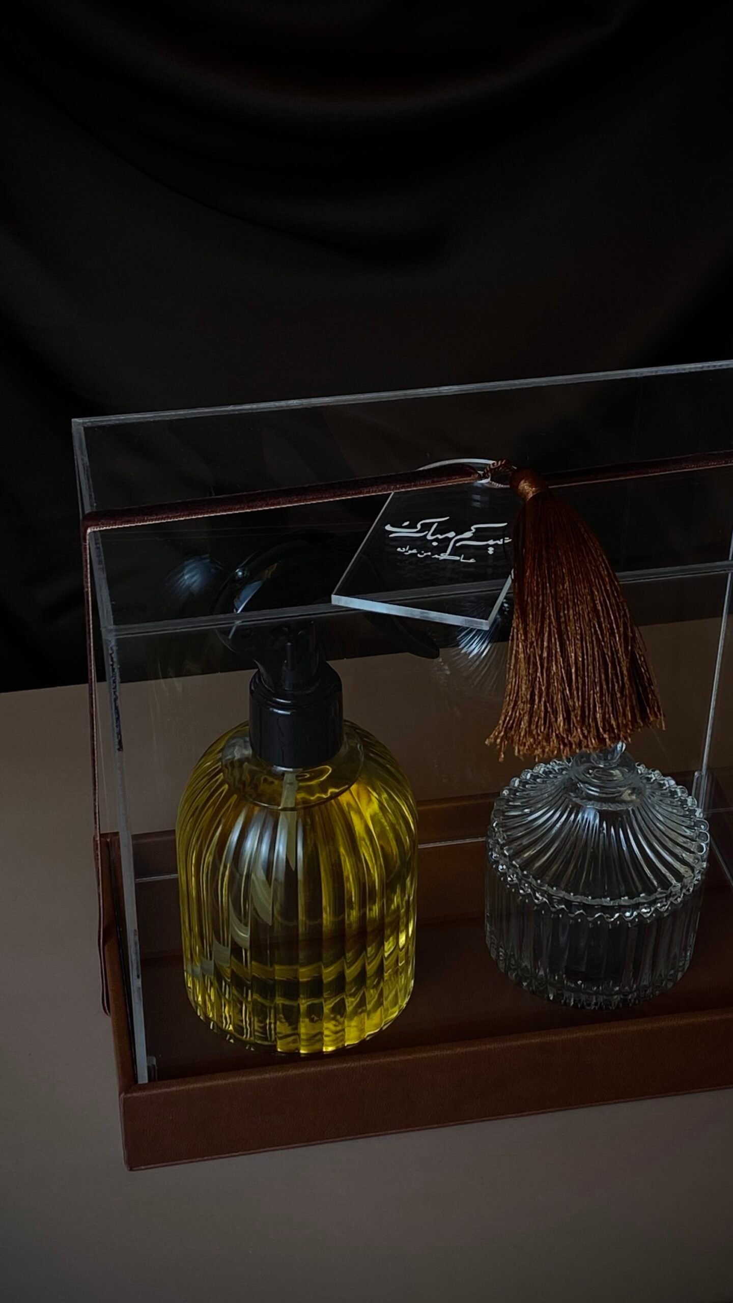 بوكس جلد مع غطاء اكريليك يحتوي على معطر منزلي برائحة الفانيلا ودخون القصر